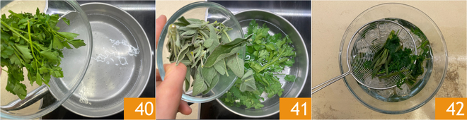 Bringen Sie einen Topf mit Wasser zum Kochen und blanchieren Sie die Petersilie 40 und den Salbei 41 für eine Minute. Übertragen Sie die Kräuter in Eiswasser, um den Garvorgang zu stoppen und die Farbe zu fixieren 42.