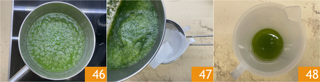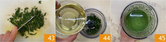 Entfernen Sie das überschüssige Wasser und hacken Sie sie grob mit einem Messer 43. Geben Sie die Kräuter in einen Mixer, fügen Sie das Pflanzenöl 44 hinzu und mixen Sie, bis eine homogene Mischung entsteht 45.