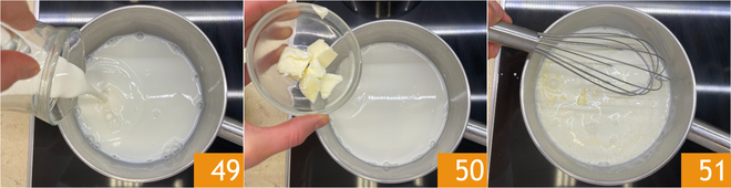 Erhitzen Sie die Milch und die Sahne in einem kleinen Topf bei hoher Hitze 49, dann fügen Sie die Butter hinzu 50 und rühren, um sie aufzulösen 51.