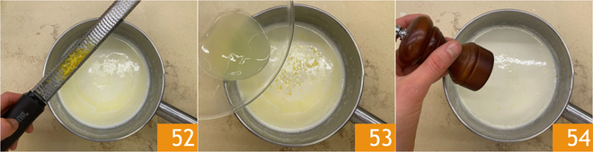 Nehmen Sie den Topf vom Herd und fügen Sie die Schale 52 und den Zitronensaft 53 hinzu. Würzen Sie mit Salz und weißem Pfeffer 54, dann lassen Sie es ruhen.
