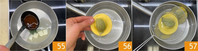 Nehmen Sie den reduzierten Bratfond und gießen Sie ihn in eine Pfanne mit einem Teil der Butter 55, dann lassen Sie sie sanft schmelzen. In der Zwischenzeit tauchen Sie die gefrorenen Ravioli in das kochend heiße gesalzene Wasser, achten Sie darauf, dass es nicht zu stark kocht, um zu verhindern, dass sie sich öffnen 56. Kochen Sie die Ravioli etwa 5 Minuten lang, dann schöpfen Sie sie ab und geben Sie sie in die Pfanne mit dem Dressing 57.
