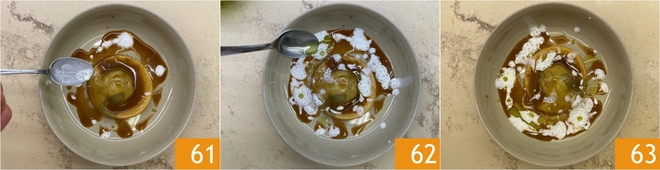 Fügen Sie die restliche Butter hinzu 58 und schwenken Sie die Pfanne vorsichtig, um sie zu emulgieren, ohne Gefahr sie zu zerbrechen 59. Zu diesem Zeitpunkt nehmen Sie den Zitronenschaum und mixen ihn kurz mit einem Handmixer, um einen leichten Schaum zu bilden 60.