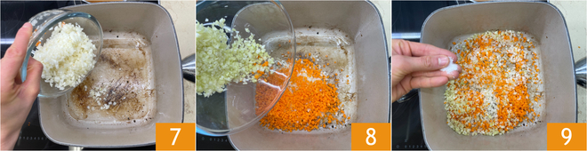 Fügen Sie dem Bratfond die Zwiebel 7, die sehr fein gehackten Karotten und den Sellerie hinzu 8, dann salzen 9 und etwa zehn Minuten lang bei schwacher Hitze anschwitzen, dabei häufig umrühren.