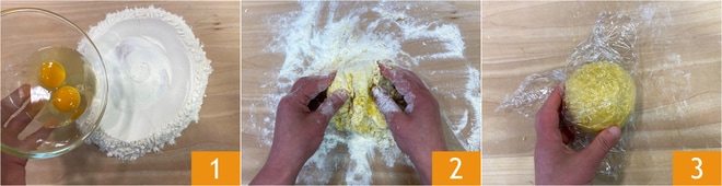 Um die Ravioli Käse und Pfeffer zuzubereiten, machen Sie zuerst einen Mehlhaufen auf einer Arbeitsplatte und geben die Eier in die Mitte 1. Kneten Sie 2, bis Sie einen glatten und homogenen Teig erhalten. Wickeln Sie ihn in Frischhaltefolie 3 und lassen Sie ihn 30 Minuten im Kühlschrank ruhen.