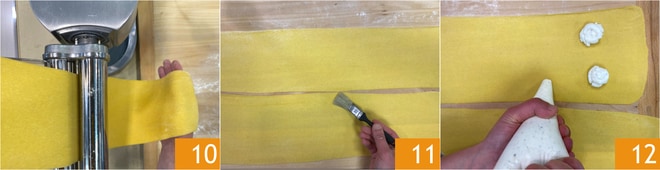 Nehmen Sie den Teig und rollen Sie sehr dünne Blätter aus 10, bis sie etwa 1 mm dick sind. Bestreichen Sie die Blätter mit Wasser 11 und füllen Sie sie, indem Sie ordentliche Häufchen der Füllung mit dem Spritzbeutel positionieren 12.