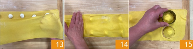 Bedecken Sie sie mit einem weiteren Blatt 13 und drücken Sie die Ränder gut fest 14. Stechen Sie die Ravioli mit einem Ausstecher aus 15.