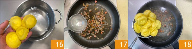 Kochen Sie die Ravioli in reichlich gesalzenem, kochendem Wasser 16. In der Zwischenzeit geben Sie den Guanciale in eine Antihaft-Pfanne und braten ihn, bis er knusprig ist. Wenn die Ravioli gekocht sind, geben Sie eine Kelle Kochwasser 17 und die abgetropften Ravioli 18 in die Pfanne, dann lassen Sie sie einige Minuten durchziehen.