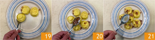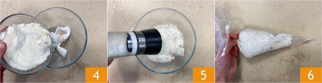 Bereiten Sie in der Zwischenzeit die Füllung vor: Geben Sie den Ricotta in eine Schüssel, fügen Sie den Pecorino hinzu 4 und würzen Sie mit Salz und Pfeffer 5. Vermengen Sie alles gut und füllen Sie es in einen Spritzbeutel 6.