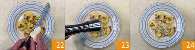 Vervollständigen Sie das Gericht mit einer Prise Pecorino 22 und Pfeffer 23. Die Ravioli Käse und Pfeffer sind servierfertig 24!