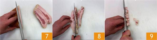 Schneiden Sie den Guanciale zuerst in Scheiben 7, dann in Streifen 8 und schließlich in Würfel 9 und legen Sie ihn beiseite.