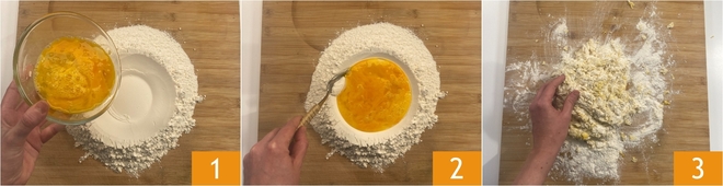 Um die Ravioli mit Erbsen und Gorgonzola-Fondue zuzubereiten, beginnt ihr mit dem frischen Nudelteig: Verfahrt klassisch, formt aus dem Mehl einen Krater und gebt die Eier in die Mitte 1, dann beginnt ihr, das Mehl mit einer Gabel in die Eier einzuarbeiten 2 und wenn die Konsistenz es zulässt, arbeitet ihr weiter mit den Händen, den Teig kräftig zu kneten 3, ohne ihn zu zerreißen, und ihn dabei etwa 10 Minuten lang immer wieder kräftig auf die Arbeitsfläche zu schlagen.