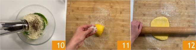 Würzt mit reichlich frisch gemahlenem Pfeffer 10 und etwas Salz und arbeitet mit einem Spatel, bis alles gut vermischt ist. Wenn die Masse homogen ist, füllt sie in einen Spritzbeutel und stellt ihn beiseite. Holt den Teig zurück. Nehmt mit dem Teigschaber etwa 1/4 des Teigs ab, plattiert ihn mit etwas Mehl auf der Arbeitsfläche 11 und beginnt dann mit dem langen Nudelholz geduldig auszurollen 12, indem ihr ihn in alle Richtungen dreht und zieht, bis ihr eine dünne Teigplatte habt.