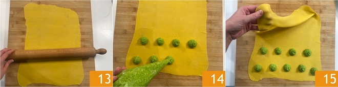 Wenn ihr eine dünne Teigplatte von etwa 1–2 mm erreicht habt 13, gebt auf die zur euch gewandte Hälfte Häufchen der Füllung, einige Zentimeter voneinander entfernt 14. Dann klappt die obere Hälfte wie ein Umschlag über die untere 15.