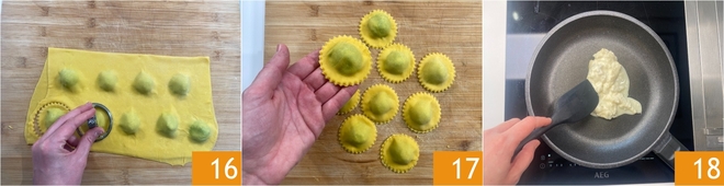 Drückt rund um die Häufchen gut an und stecht dann eure Ravioli mit einem gezackten runden Ausstecher von 6,5 cm Durchmesser aus 16. Überschüssiger Teig kann nach einer weiteren Ruhezeit wieder ausgerollt werden. So weitermachen, bis alle Ravioli fertig sind 17. In einer Pfanne bei niedriger Temperatur den Gorgonzola schmelzen lassen 18.