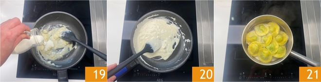 Mit der Sahne 19 verdünnen, umrühren und sobald sich beide gut verbunden haben 20, die Ravioli etwa 3 Minuten in kochendem Salzwasser garen 21.
