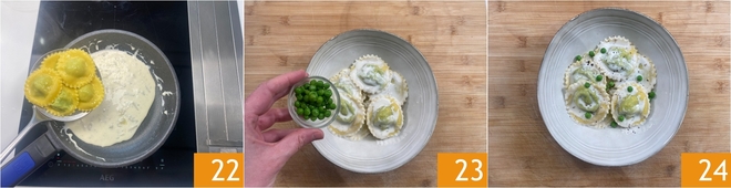 Die Ravioli direkt in die Pfanne zum Dressing abgießen 22, kurz ziehen lassen und dann die Ravioli auf Tellern anrichten, zusammen mit den beiseitegelegten ganzen Erbsen 23. Die Ravioli mit Erbsen und Gorgonzola-Fondue sind servierbereit 24.
