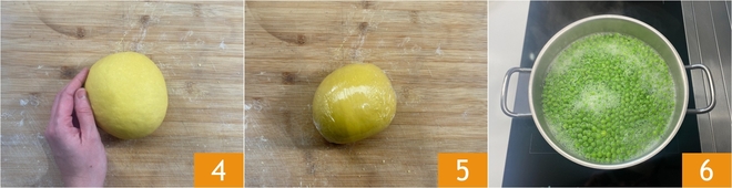Wenn er schön glatt ist 4, deckt ihn mit Frischhaltefolie ab 5 und lasst ihn mindestens 30 Minuten bei Raumtemperatur ruhen. In der Zwischenzeit die Erbsen 6–7 Minuten in kochendem Salzwasser blanchieren 6.