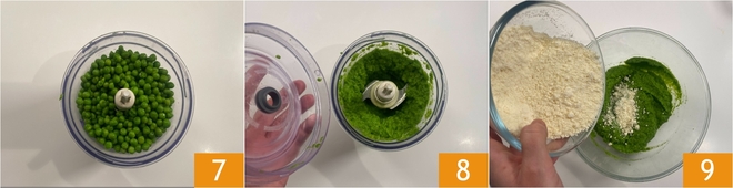 Abgießen und in Eiswasser abschrecken, um die leuchtende Farbe zu erhalten. Nehmt einen Esslöffel davon zur Seite, um die Teller zu dekorieren. Gebt die restlichen Erbsen in den Mixer 7 und püriert sie fein 8. Gebt die Erbsencreme und den geriebenen Käse in eine Schüssel 9.
