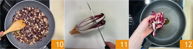Bratet ihn bei mittlerer Hitze etwa 10 Minuten an 10 und stellt ihn beiseite, er wird für die Füllung benötigt. Jetzt schneidet nur die Spitzen des Radicchio tardivo ab 11 und bratet diese in derselben Pfanne bei mittlerer Hitze mit wenig Öl für ein paar Sekunden an 12; das dient zum Garnieren der Teller.