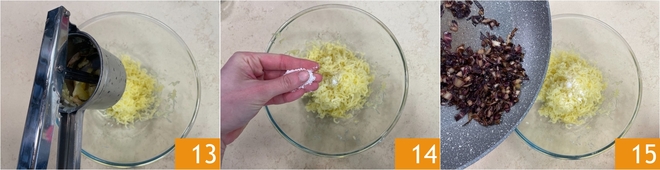 Nehmt die gekochten Kartoffeln und presst sie durch die Kartoffelpresse 13, gebt das Püree in eine Schüssel, salzt es 14 und hebt den in der Pfanne geschwenkten langen Radicchio unter 15.