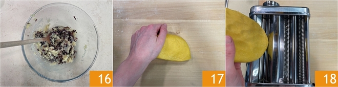 Vermischt alles, bis eine homogene Masse entsteht 16 und stellt sie beiseite. Holt nun den Teig, nehmt die Hälfte davon 17 und bewahrt den Rest in Folie auf, damit er nicht austrocknet. Drückt den Teigling flach und zieht ihn durch die Walzen der Nudelmaschine 18.
