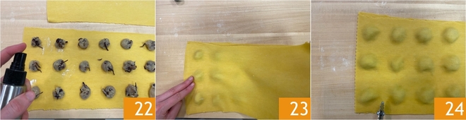 Spritzt etwas Wasser an die Ränder 22, damit die Teigränder besser kleben, und legt eine weitere Teigbahn darüber 23. Drückt die Ränder gut zusammen, damit die Luft entweicht. Jetzt schneidet ihr die Ravioli mit einem gezackten Teigrad aus 24.