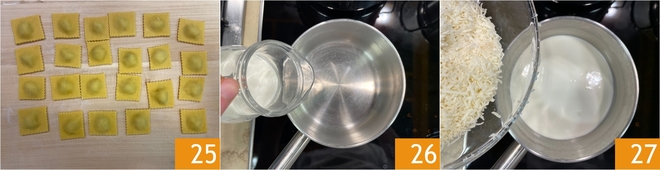 Die Ravioli sind fertig 25. Nun das Käsefondue zubereiten: Erwärmt die Sahne in einem kleinen Topf 26, gebt den geriebenen Käse dazu 27 und lasst ihn bei schwacher Hitze schmelzen.