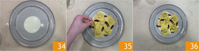 Richtet an, indem ihr das Käsefondue in die Mitte gießt 34, dann die Ravioli darauf setzt und mit dem in der Pfanne geschwenkten Radicchio tardivo 35 sowie frischen Majoranblättchen garniert. Serviert die Ravioli mit Radicchio, Kartoffeln und Käsefondue sofort 36.