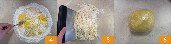 Arbeitet das Mehl zuerst mit einer Gabel ein 4, dann verwendet den Teigschaber 5 und knetet schließlich von Hand, bis ein homogener Teigling entsteht. Wickelt ihn in Frischhaltefolie und legt ihn in den Kühlschrank 6.