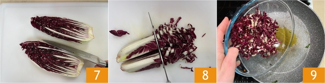 Jetzt den langen Radicchio vorbereiten: Halbiert ihn der Länge nach 7 und schneidet ihn in Streifen 8. Erhitzt eine Pfanne mit etwas Öl und gebt den Radicchio hinein 9.