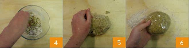 dann von Hand 4 und sobald die Eier vollständig absorbiert sind, übertragen Sie den Teig auf die Arbeitsfläche 5. Kneten Sie, bis Sie einen glatten und kompakten Teigball erhalten. Wickeln Sie den Teig in Frischhaltefolie und lassen Sie ihn 30 Minuten ruhen 6.