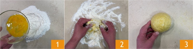 Um das Raviolone mit flüssigem Eigelb, Ricotta und Spargel zuzubereiten, kümmern Sie sich zuerst um die frische Pasta. Auf einer Arbeitsfläche das Mehl in einer Fontäne anordnen, die geschlagenen Eier in die Mitte geben 1 und kneten 2, bis ein glatter und homogener Teig entsteht 3. Wickeln Sie ihn in Frischhaltefolie ein und lassen Sie ihn mindestens 30 Minuten im Kühlschrank ruhen.