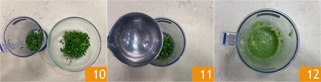 Ein Teil des Spargels wird entnommen und in einen Mixer gegeben 10, ein wenig Wasser hinzufügen 11 und pürieren, bis eine glatte und homogene Creme entsteht 12. Beiseitestellen.