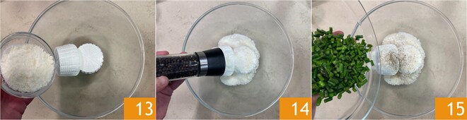 In einer Schüssel Ricotta geben und den Parmesan hinzufügen 13. Salzen und pfeffern 14, dann die Spargelstücke hinzufügen 15.
