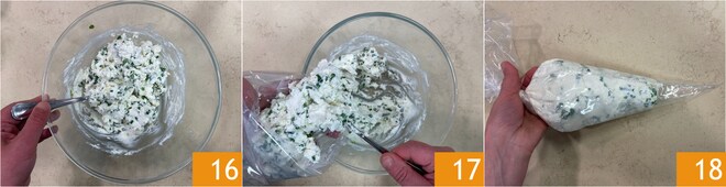 Mit einer Gabel bearbeiten 16 und alles 17 in einen Spritzbeutel 18 geben.