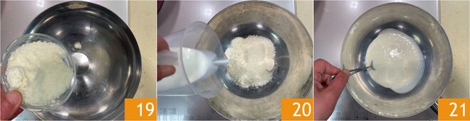 In der Zwischenzeit die Parmesansauce zubereiten: Eine Schüssel im Wasserbad erhitzen, darin den Parmesan 19 geben, die Milch hinzufügen 20 und rühren, bis eine glatte Creme entsteht 21.