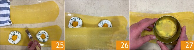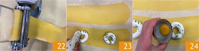 Nehmen Sie den Teig aus dem Kühlschrank und rollen Sie ihn mit einem Nudelholz oder einer Nudelmaschine aus, bis Sie einen dünnen Teig von etwa 2 mm Dicke erhalten 22. Mit dem Spritzbeutel die Teigplatte mit Ringen füllen 23 und in jedem von ihnen ein Eigelb 24 und eine Prise Salz geben.