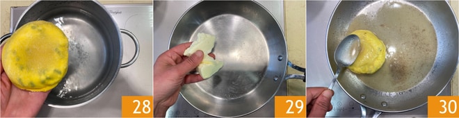 Für 3 Minuten in gesalzenem kochendem Wasser kochen 28. In der Zwischenzeit in einer Pfanne die Butter mit etwas Kochwasser der Pasta schmelzen 29. Die Ravioli abgießen und einige Minuten in der Pfanne würzen lassen 30.