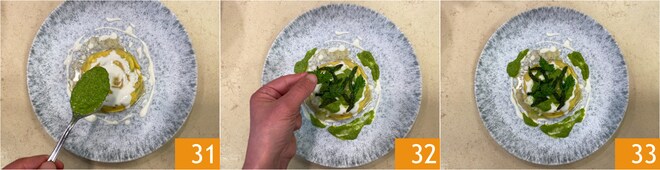 Richten Sie an und garnieren Sie mit der Parmesansauce, der Spargelsauce 31, auf der Oberfläche des Ravioloni einige Spargelspitzen und einige frische Kerbelblätter positionieren 32. Das Raviolone mit flüssigem Eigelb, Ricotta und Spargel ist servierfertig 33.