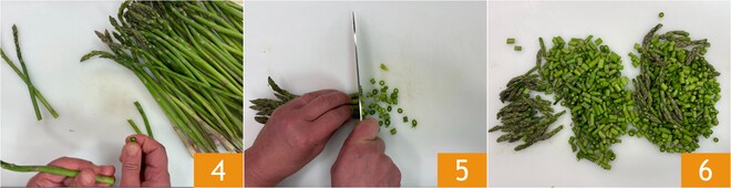 In der Zwischenzeit entfernen Sie den holzigsten Teil des Spargels 4 und schneiden Sie ihn in Stücke 5, lassen Sie einige Spitzen ganz, diese werden zur Dekoration verwendet 6.