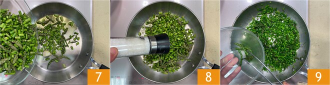 In einer Pfanne das Öl erhitzen, eine Knoblauchzehe hinzufügen und den Spargel dazugeben 7. Mit Salz und Pfeffer abschmecken 8 und 15 Minuten kochen lassen oder bis sie weich sind. Einige Spitzen für die abschließende Dekoration aufbewahren 9.