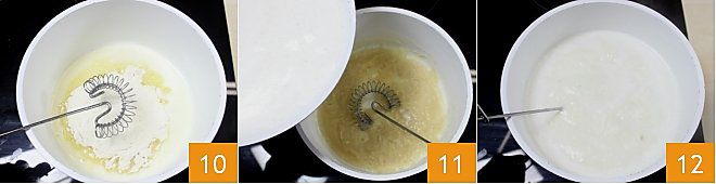 und fügen Sie das gesiebte Mehl hinzu, lassen Sie alles für ein paar Minuten kochen, rühren Sie kontinuierlich und vermeiden Sie, dass es anhaftet 10. Sie haben so das, was die Franzosen Roux nennen, erhalten. An diesem Punkt nehmen Sie den Topf vom Herd und fügen dem Roux die warme Milch hinzu, rühren Sie alles mit einem Holzlöffel 11. Setzen Sie dann den Topf zurück auf den Herd und lassen Sie die Sauce bei schwacher Hitze kochen, bis sie zu kochen beginnt. Decken Sie den Topf mit einem Deckel ab und lassen Sie die Béchamelsauce bei schwacher Hitze für 15 Minuten kochen, die benötigte Zeit, um die Sauce eindicken zu lassen, rühren Sie gelegentlich 12. Damit ist Ihre Béchamelsauce bereit,
