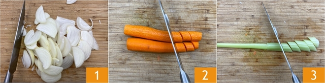 Um die Arancini mit Fleisch und Béchamel zuzubereiten, bereiten Sie zunächst das Soffritto für das Kochen des Fleisches vor: Schälen und schneiden Sie die Zwiebeln 1, die Karotten 2 und den Sellerie 3 grob.