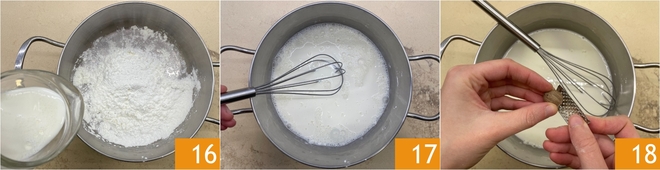 Für die Béchamel: Geben Sie die Maisstärke und einen Teil der Milch in einen kleinen Topf 16, dann gut mit einem Schneebesen verrühren 17 und mit Muskatnuss aromatisieren 18.