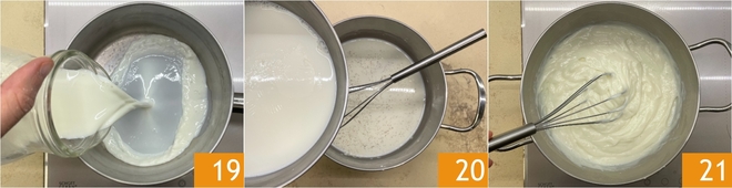 In der Zwischenzeit bringen Sie die restliche Milch in einem separaten kleinen Topf zum Kochen 19. Fügen Sie die heiße Milch zur Stärke-Mischung hinzu und rühren alles mit dem Schneebesen glatt 20, dann lassen Sie die Béchamel auf dem Herd eindicken, während Sie weiter rühren, um Klumpen zu vermeiden 21.