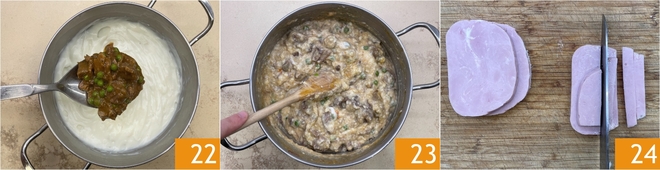 Nehmen Sie den Topf vom Herd und fügen das Fleisch zur noch warmen Béchamel hinzu 22, dann mischen Sie 23 und geben alles in eine Auflaufform. Schneiden Sie nun den gekochten Schinken in Würfel 24.