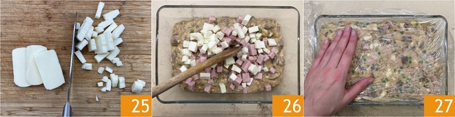 Schneiden Sie auch die Mozzarella in Würfel 25. Fügen Sie den Schinken und die Mozzarella zur Füllung hinzu und mischen gut 26. Decken Sie mit Frischhaltefolie ab 27 und lassen es im Kühlschrank abkühlen.