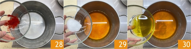 Zum Schluss widmen Sie sich dem Reis: In einem schmalen Topf geben Sie Wasser, Safran 28, Salz 29 und Öl 30 hinzu.