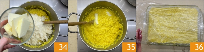 Fügen Sie auch die Butter hinzu 34 und mischen gut 35. Geben Sie den Risotto in eine Auflaufform, decken mit Frischhaltefolie ab und lassen es etwa zehn Minuten ruhen; so wird er weiter garen 36.