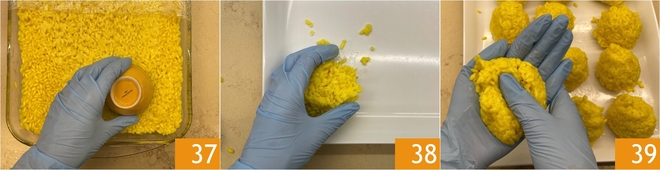 Wenn der Risotto noch lauwarm ist, nehmen Sie Portionen von etwa 80 g 37, formen Sie Bällchen und legen diese auf ein Tablett 38. Drücken Sie eine Mulde mit dem Daumen in die Mitte des Reisbällchens 39.